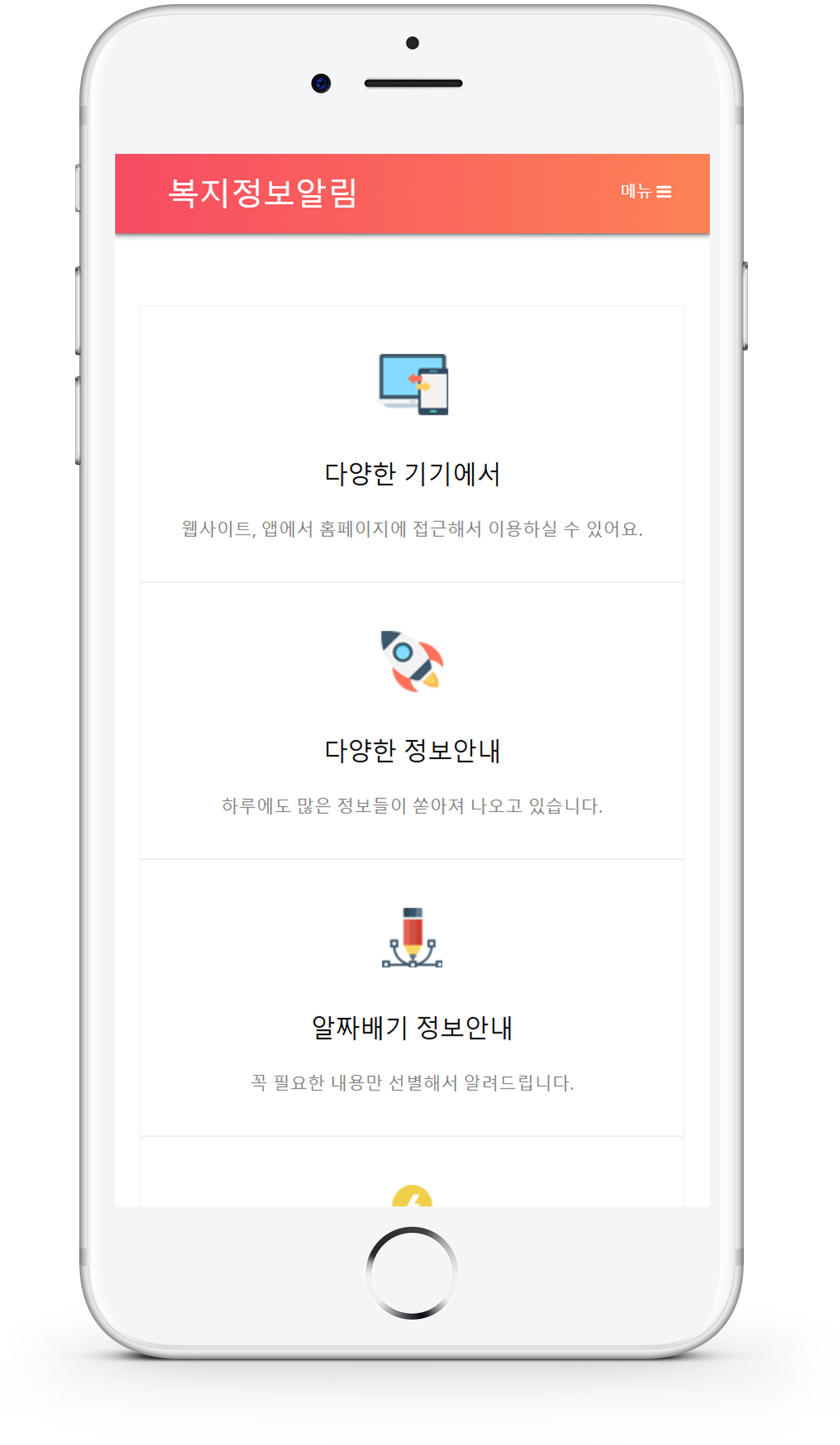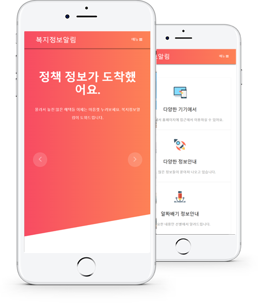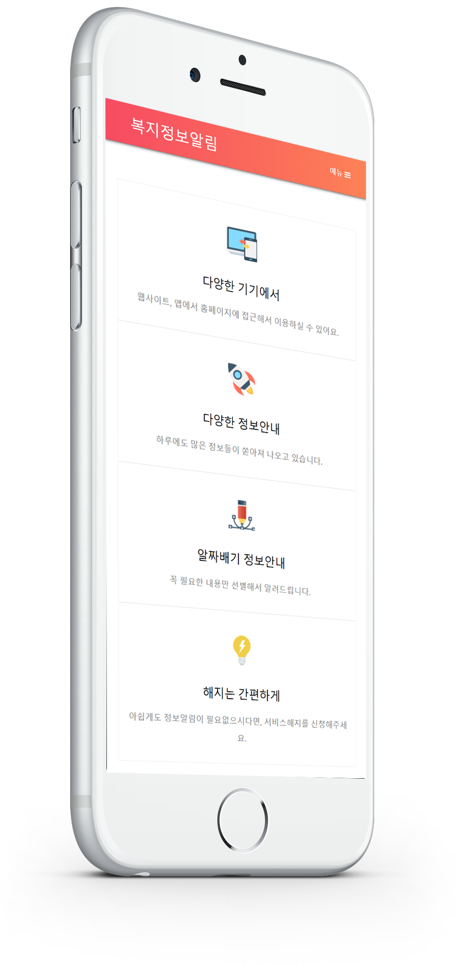 놓치기 쉬운 국가 정책등 유용한 정보들을 알림으로 보내드립니다. 기간이 정해져 있는 정책의 경우 정보를 몰라서 혜택을 못받는 경우가 없도록 SMS문자를 보내드립니다.
